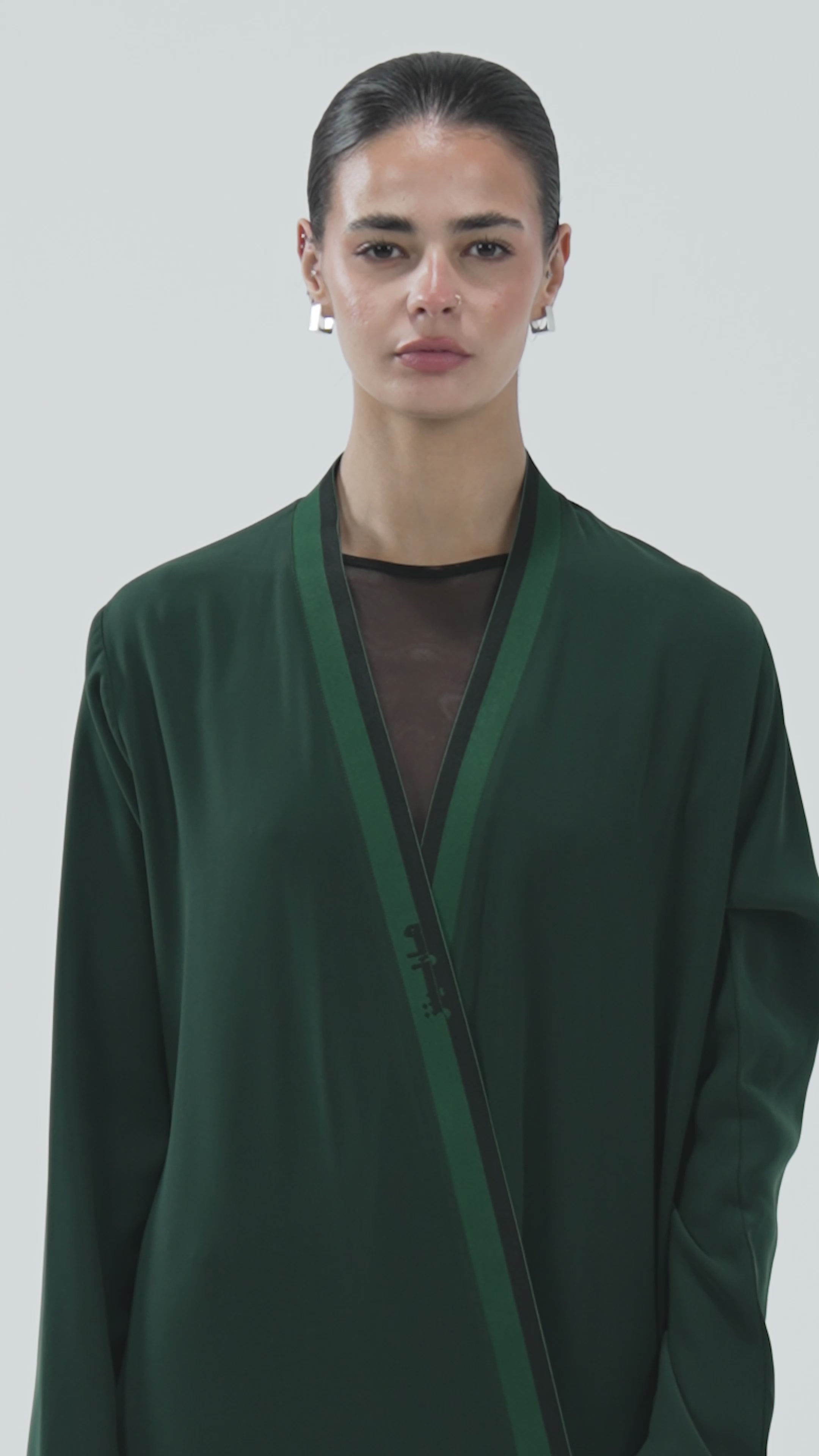 ORIGINAL FRAME is the mastered piece of the collection — a true signature of refined presence. Crafted in deep green canvas, this abaya is framed with a distinctive band that anchors the look with clarity and strength. Every line is intentional, making it a timeless symbol of grounded elegance. A statement piece that embodies the collection’s essence with quiet confidence.