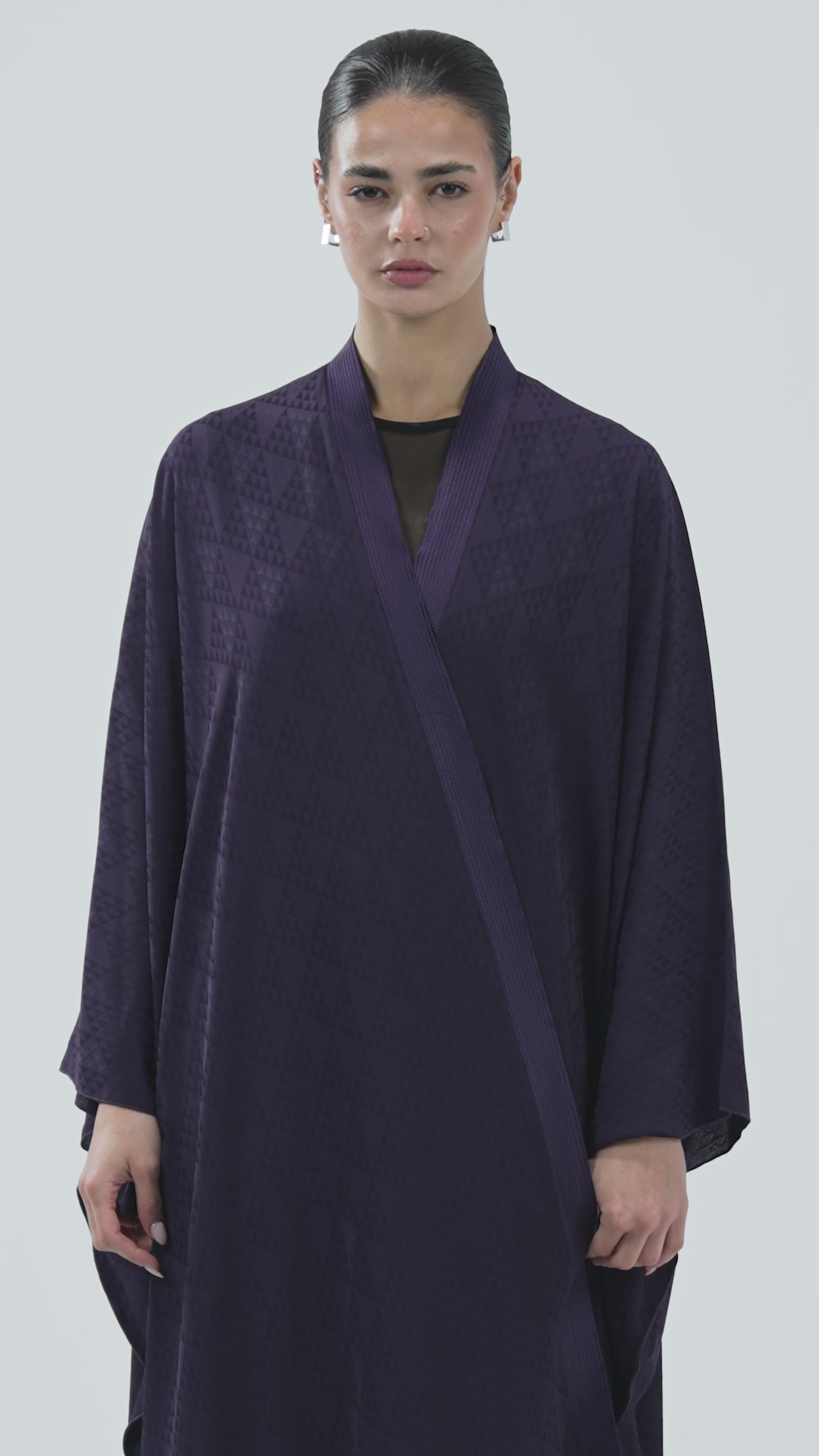 The Rooted Hue Abaya blends rich texture with luminous contrast. Crafted from subtle jacquard, its surface reveals delicate details that shift gently with the light. A glossy band in soft, radiant fabric frames the look, adding a fresh summer touch while preserving an air of quiet sophistication. Lightweight yet refined, it’s the perfect companion for warmer days.